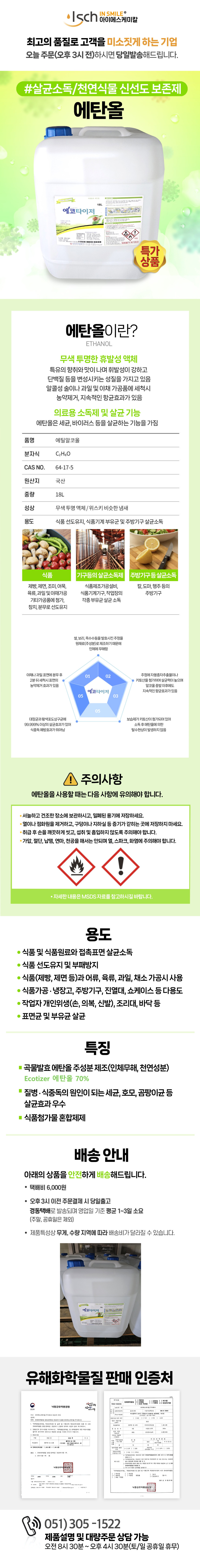 품목 및 제품명 삼전 에탄올 에코타이저 살균소독제 18L 곡물발효 에탄올